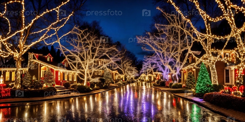 Рождественские ночные огни. Потрясающая улица с домами, украшенными разноцветными рождественскими огнями, создающими волшебное сияние