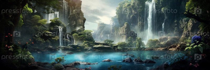 Фэнтезийный пейзаж с водопадами на закате, панорама. Генеративный ИИ