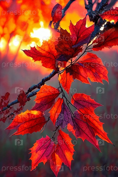 Осенняя элегантность. Богатые цвета и текстуры осенней листвы на закате, запечатлевшие сложные детали отдельных листьев, сияющих в угасающем свете дня