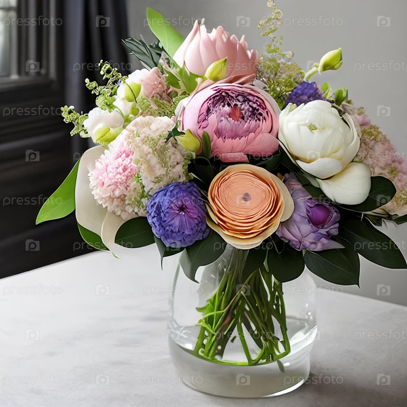 Изысканная цветочная композиция с использованием смеси различных цветов, таких как пионы, гортензии и лютики