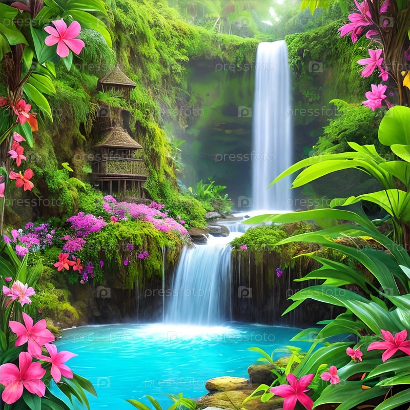 Фэнтезийный пейзаж с водопадами, тропическими цветами на переднем плане. Генеративный ИИ