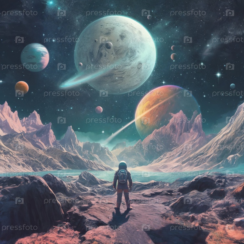 Астронавт исследует фантастическую планету, на фоне ночного неба. Генеративный ИИ