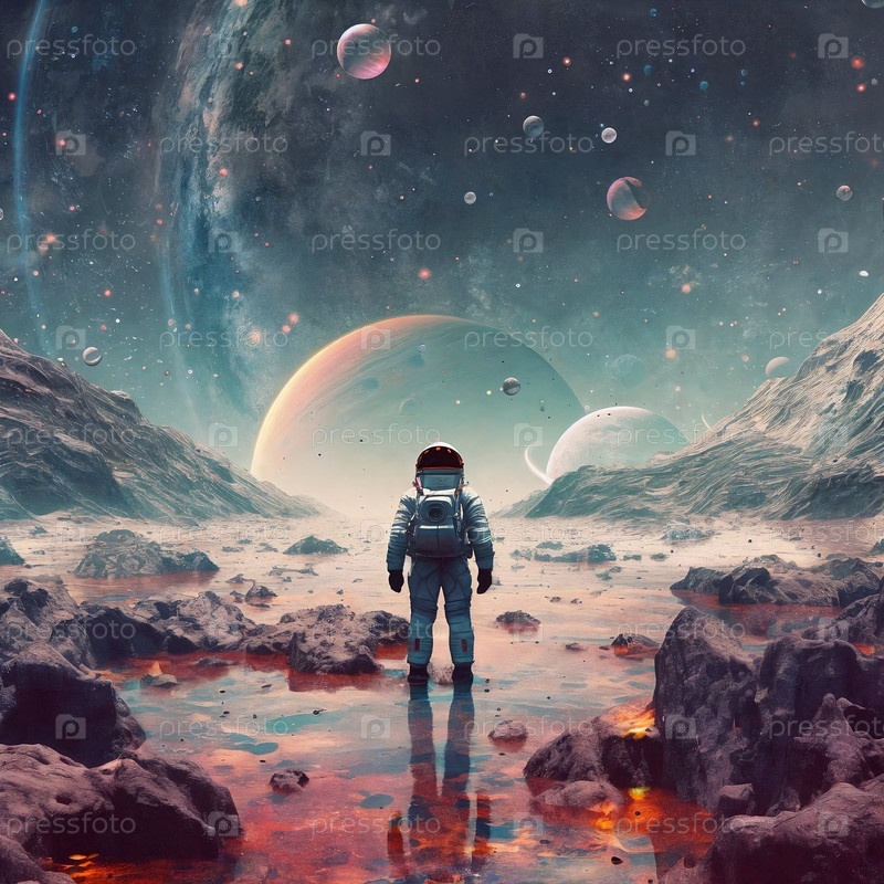 Астронавт исследует фантастическую планету, ночное небо со звездами и планетами на фоне. Генеративный искусственный интеллект