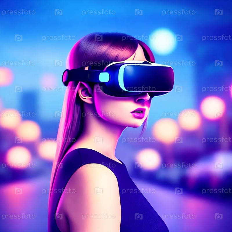 Портрет женщины в очках виртуальной реальности. Генеративный искусственный интеллект