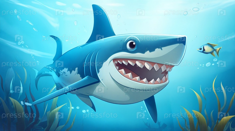 Мультяшная акула игриво плавает в подводном мире, ее анимированное выражение лица выражает одновременно очарование и любопытство. Генеративный искусственный интеллект