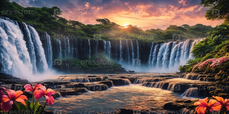 Фэнтезийный пейзаж с водопадами, цветами и тропическими растениями на переднем плане, панорама. Генеративный ИИ