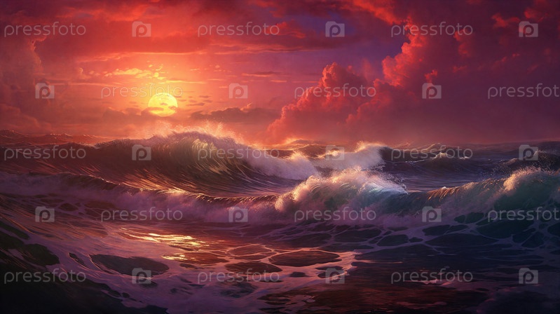 Закат над морем, волны на переднем плане, панорама. Генеративный искусственный интеллект