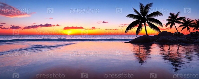 Красивая морская панорама с пальмами на закате. Генеративный ИИ