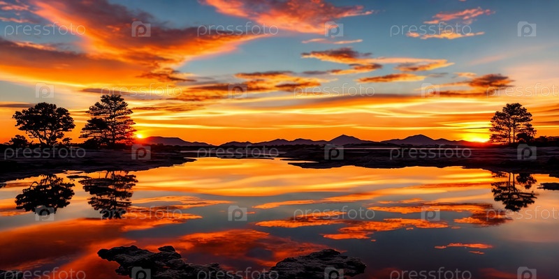 Яркий закат окрашивает небо над спокойным озером, его цвета отражаются от спокойных вод, освещая разбросанные камни. Генеративный ИИ