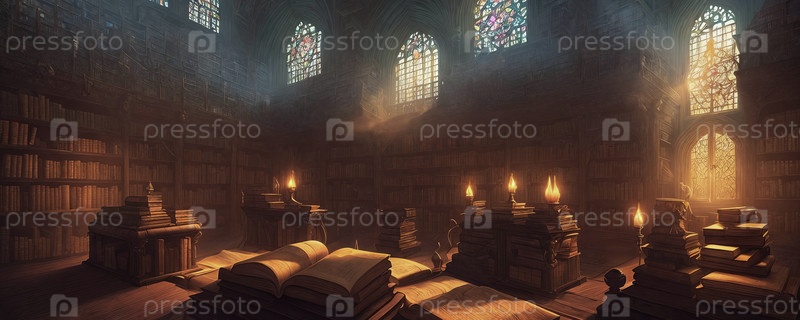 Магическая библиотека с витриной, возвышающимися полками древних томов, развевающимися пергаментами, мистическими артефактами. Генеративный ИИ