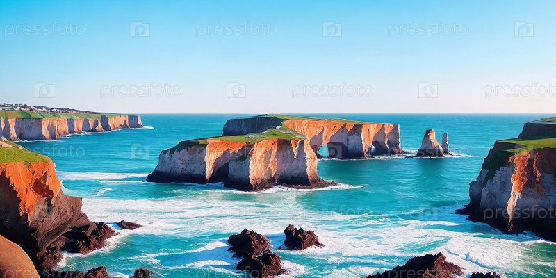 Скалы возвышаются над береговой линией. Панорама. Генеративный ИИ