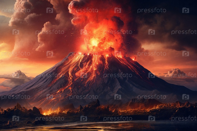 Величественный вулкан, извергающий лаву, темные перья поднимаются на фоне огненного неба. Ландшафт преобразился под воздействием ярости природы. Генеративный ИИ