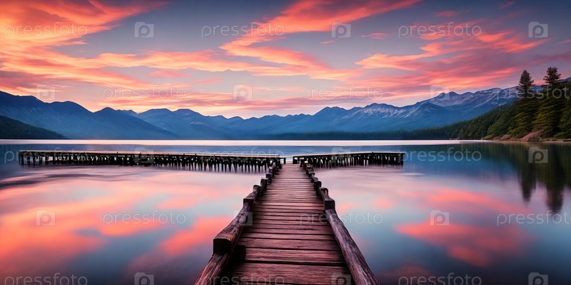 Яркий закат раскрашивает небо над спокойным озером, бросая сияющий отблеск на мирный деревянный пирс. Генеративный ИИ
