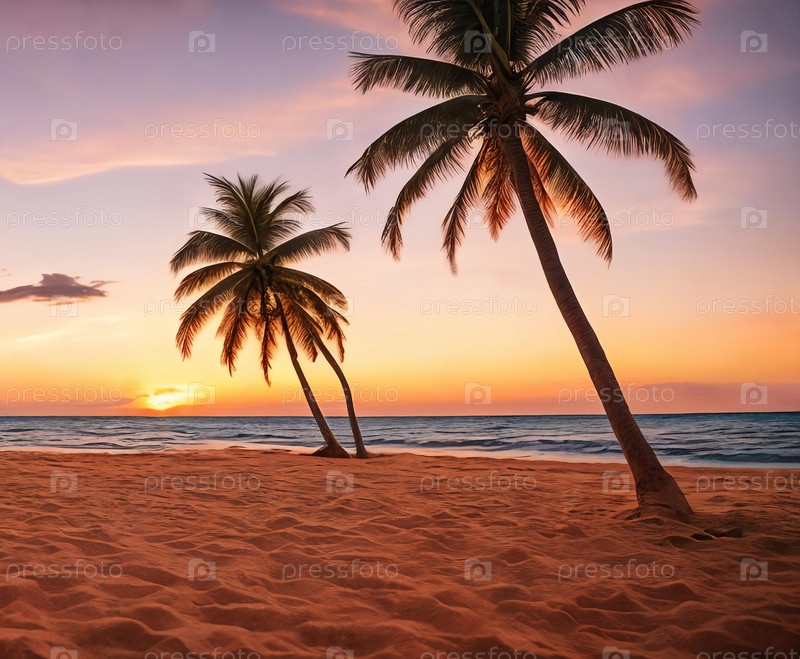 Закат окрашивает небо в оттенки оранжево-розового над тихим пляжем с плавно покачивающейся пальмой. Генеративный ИИ