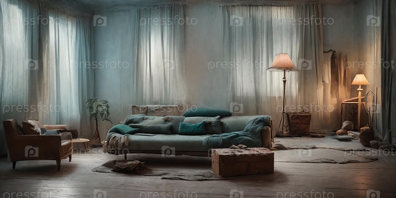 Комната заброшенного дома на закате — удлиненные тени, парящая пыль, старая мебель, окутанная золотистым светом. Генеративный ИИ