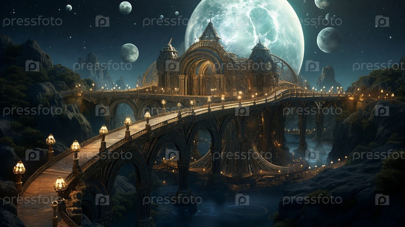 В бескрайних просторах космоса протянулся величественный мост, созданный из фантастических элементов, соединяющий неизвестные миры. Генеративный ИИ