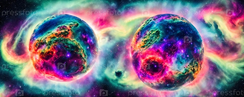 Планета небесного неба. Планета с множеством лун, красочными туманностями и завораживающим северным сиянием, заполняющим небо. Панорама. Генеративный ИИ