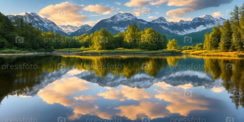 Поход через безмятежный горный лес, прибытие к тихому озеру, окруженному высокими деревьями и величественной вершиной. Генеративный ИИ