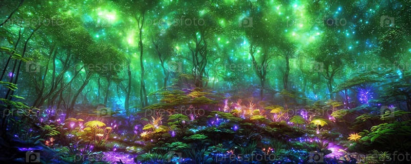Мистический лес ночью с люминесцентными растениями и существами, похожими на светлячков, освещающими сцену. Создано с помощью ИИ