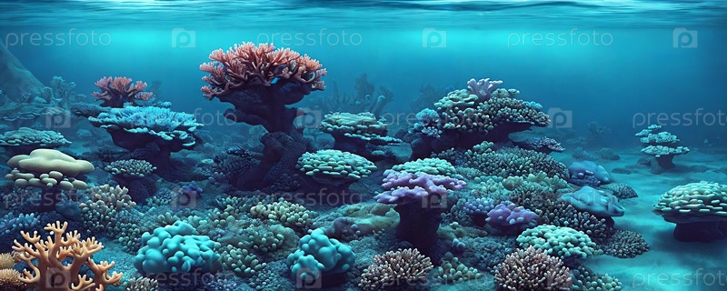 Подводное королевство с коралловыми рифами и голубой водой. Создано с помощью ИИ