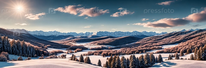 Безмятежный зимний пейзаж, живописная панорама. Заснеженные пейзажи, покрытые инеем деревья и зимние сцены. Генеративный