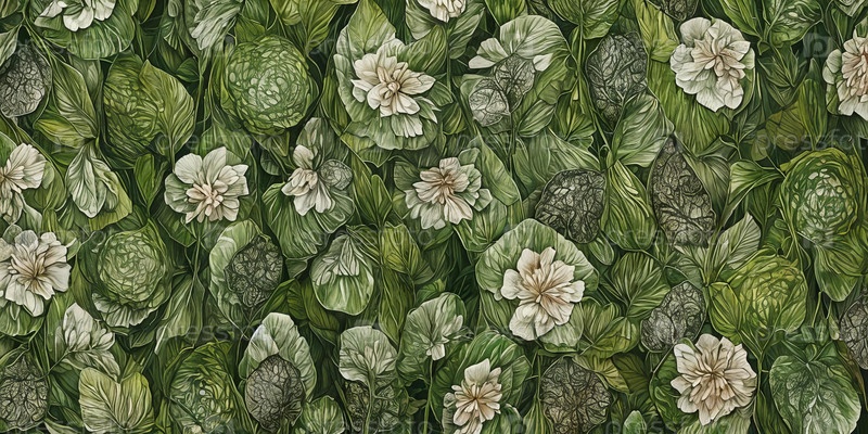 Цветы и пышные растения переплетаются, рисуя захватывающую дух картину природной красоты. Генеративный ИИ