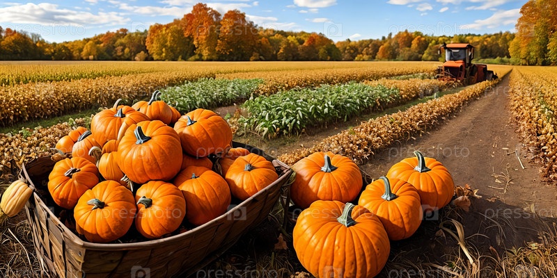 Сельский осенний урожай. Красота осенних урожаев, включая тыквы, кукурузные поля. Генеративный ИИ