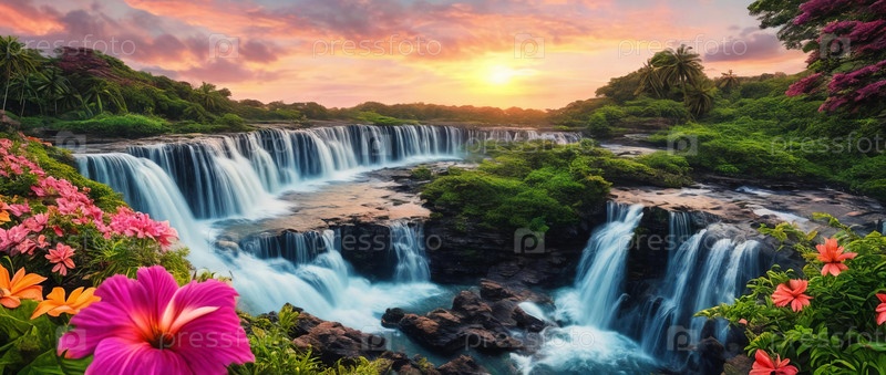 Фантастический пейзаж с водопадом на закате, панорама