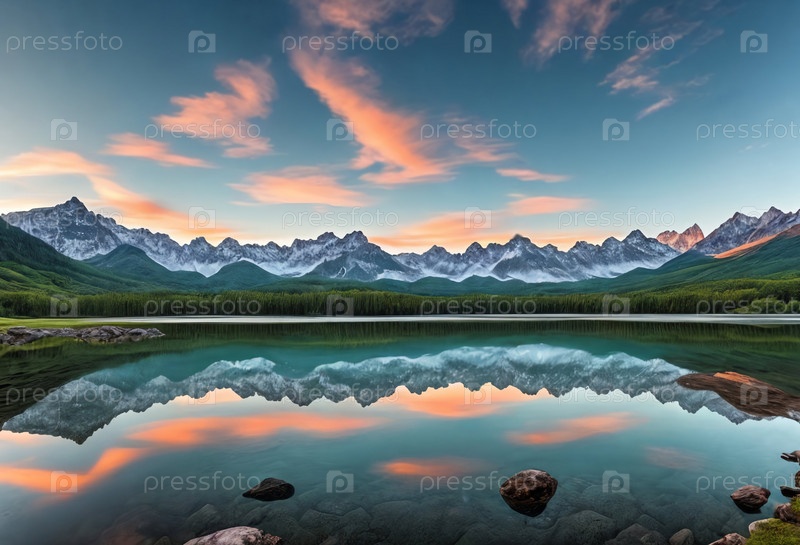 Захватывающая горная долина с тихим озером, окруженная густым лесом. Генеративный ИИ