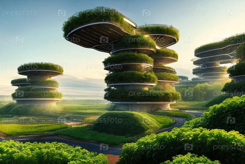 Футуристический цифровой шедевр, представляющий высокотехнологичный сельскохозяйственный центр. Посмотрите, как автоматизированные сельскохозяйственные машины процветают в вертикальных садах