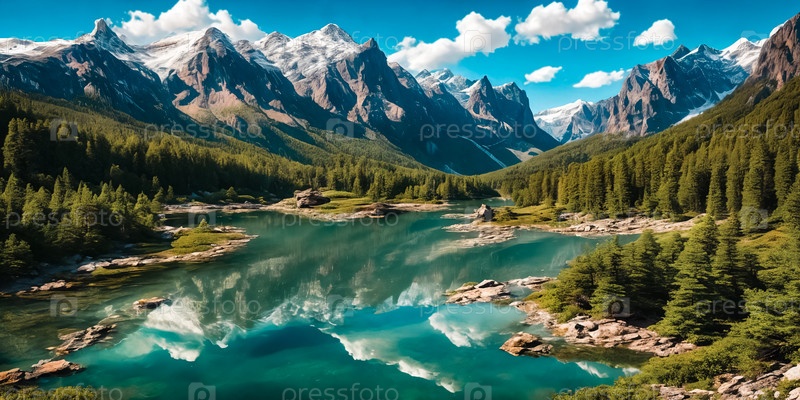 Поход через безмятежный горный лес, прибытие к тихому озеру, окруженному высокими деревьями и величественной вершиной. Генеративный ИИ