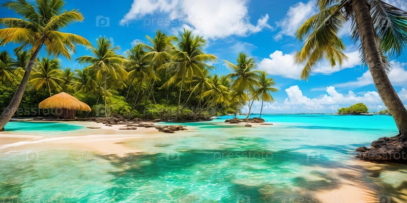 Закат окрашивает небо в оттенки оранжево-розового над тихим пляжем с плавно покачивающейся пальмой. Генеративный ИИ