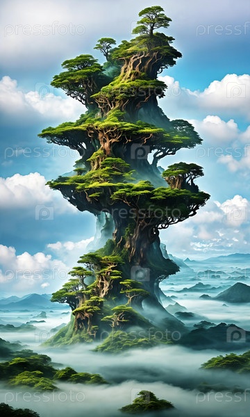 Плавающие острова. Над морем облаков острова дрейфуют, словно сказочные пейзажи. Каждый из них — миниатюрный мир, пышные леса, водопады и плавающие сады. Небо затаило дыхание, и радуги проступают сквозь туман