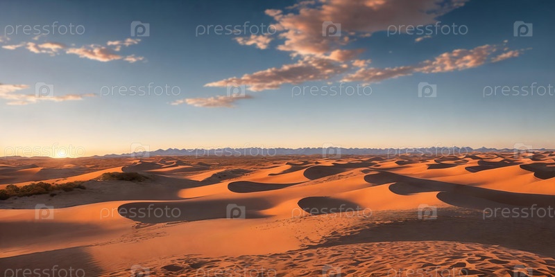 Огромное пустынное пространство с холмистыми дюнами под солнечным небом. Генеративный ИИ