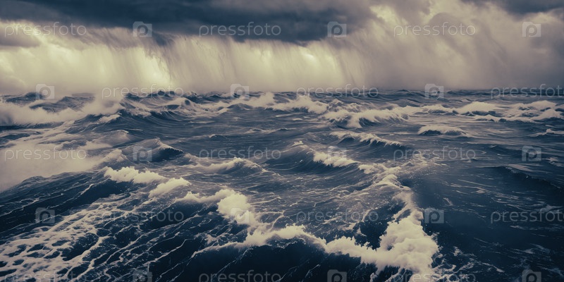 Мощь разрушительного урагана, запечатлевшего огромный штормовой нагон, затопляющий прибрежные районы, демонстрирующий неумолимую силу гнева природы. Панорама