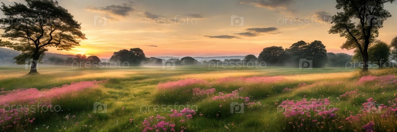 Умиротворение деревенского луга, залитого мягким светом рассвета