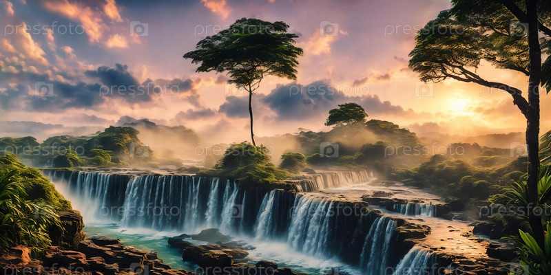 Фантастический пейзаж с водопадом на закате, панорама
