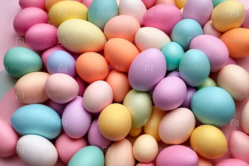 Пастельная пасхальная палитра. Визуально приятная композиция с градиентом пастельных тонов пасхальных украшений, таких как акценты в виде яиц, расположенных эстетически приятным образом, излучающих мягкую и мечтательную атмосферу
