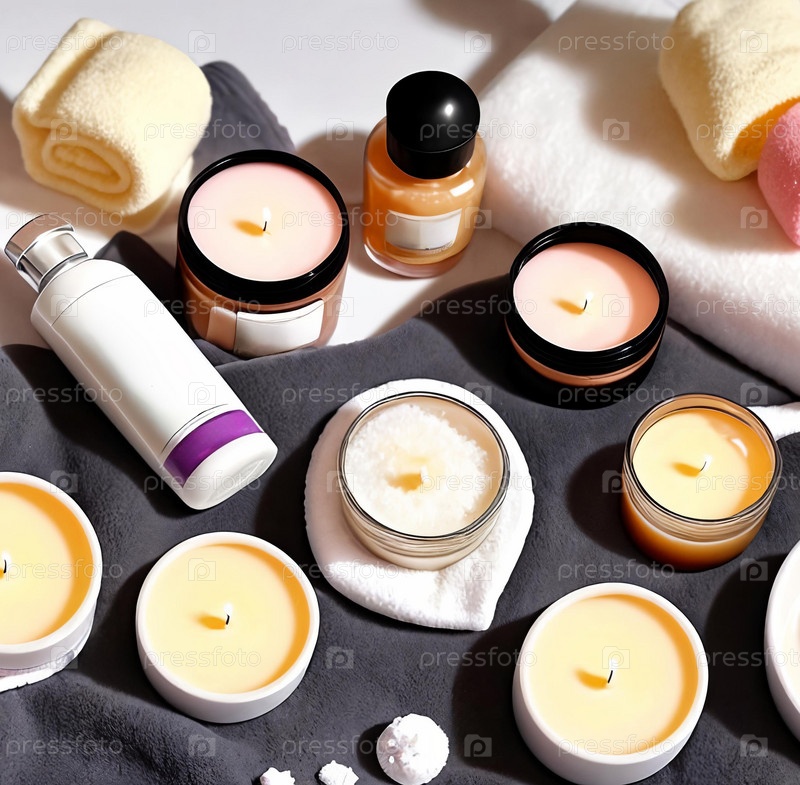 Ритуал ухода за собой. Плоская композиция из предметов первой необходимости для ухода за собой, таких как ароматические свечи, плюшевое полотенце, ароматические соли для ванн и маска для ухода за кожей, чтобы передать важность ухода за собой и релаксации