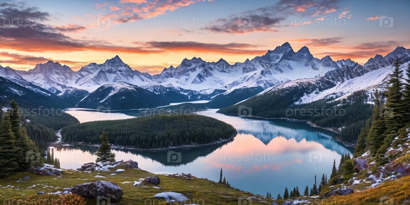 Serene Mountain Vista. Запечатлейте захватывающий восход солнца над заснеженными горами. Панорама