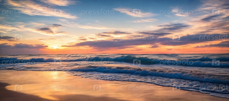 Мерцающие волны отражают теплые оттенки заходящего солнца, создавая спокойную и захватывающую дух картину. Генеративный ИИ