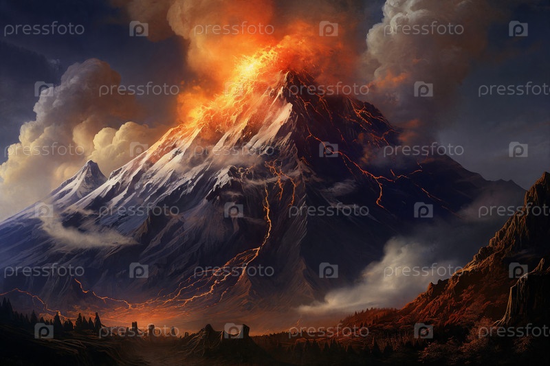 Величественный вулкан, извергающий лаву, темные перья поднимаются на фоне огненного неба. Ландшафт преобразился под воздействием ярости природы. Генеративный ИИ