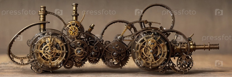 Стимпанк-часовой механизм: сложный механизм, сочетающий шестеренки, зубчатые колеса, винтажные латунные элементы, вызывающий в памяти технологии викторианской эпохи. Представьте себе слияние художественной функциональности в изношенной машине. Генеративны