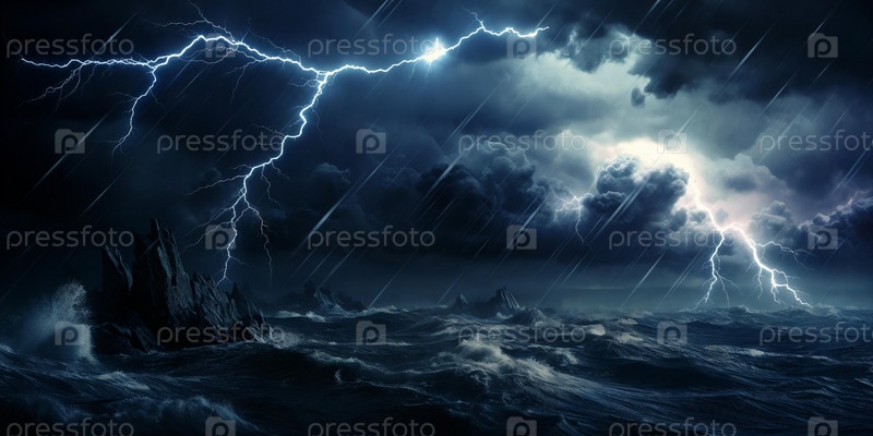 Бурное море под темными облаками с молниями, разбивающимися о волны. Генеративный ИИ