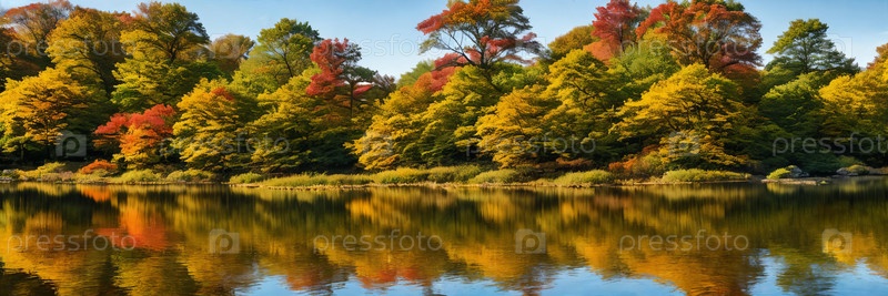 Красочная палитра осени, сосредоточенная на спокойном озере, отражающем яркую листву окружающих деревьев в солнечный день