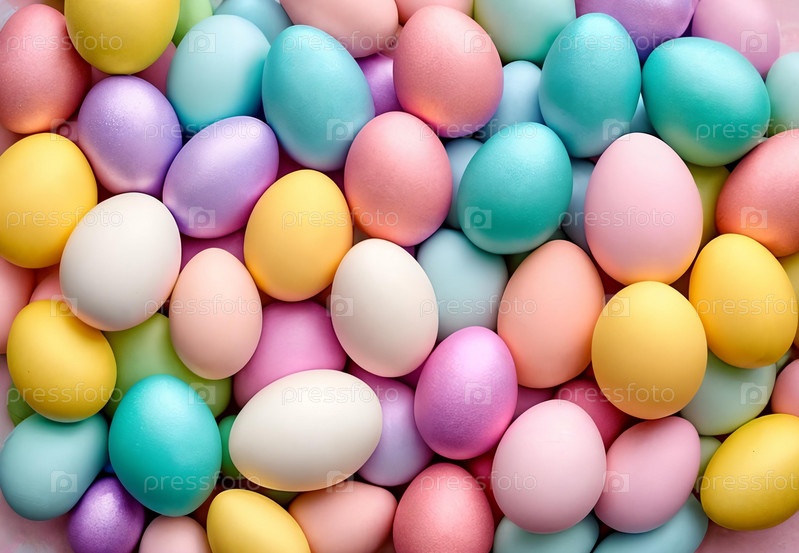 Пастельная пасхальная палитра. Визуально приятная композиция с градиентом пастельных тонов пасхальных украшений, таких как акценты в виде яиц, расположенных эстетически приятным образом, излучающих мягкую и мечтательную атмосферу