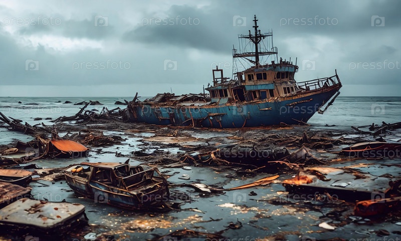 Мир кораблекрушений. Постапокалиптическая прибрежная сцена с затонувшими кораблями и выброшенным на берег мусором
