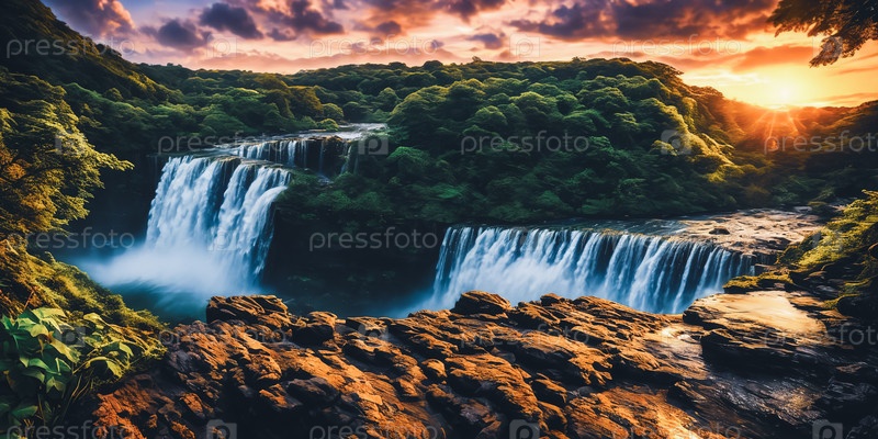 Фантастический пейзаж с водопадом на закате, панорама