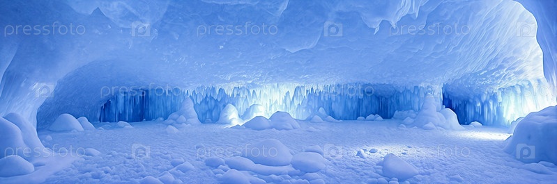 Эфирная ледяная пещера, освещенная мягким свечением биолюминесцентных кристаллов, отбрасывающих жуткий голубой свет. Генеративный ИИ