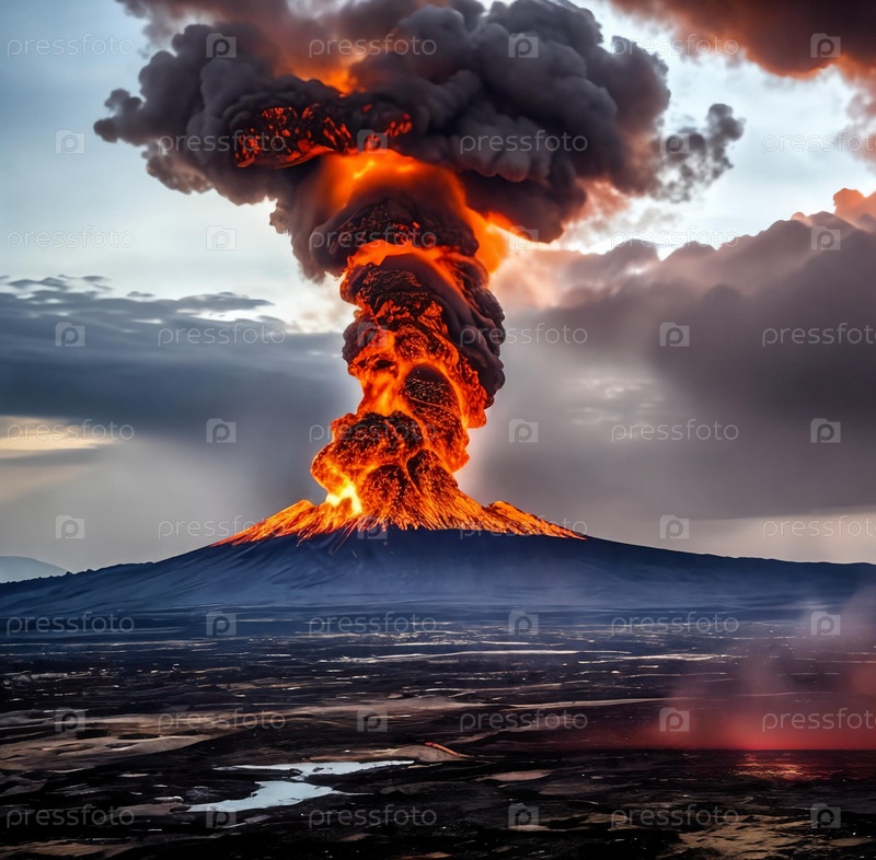 Драматическое извержение вулкана, подчеркивающее огненную лаву, вырывающуюся из кратера, и облако пепла, вздымающееся в небо, демонстрирующее изменчивую красоту ярости природы. Панорама